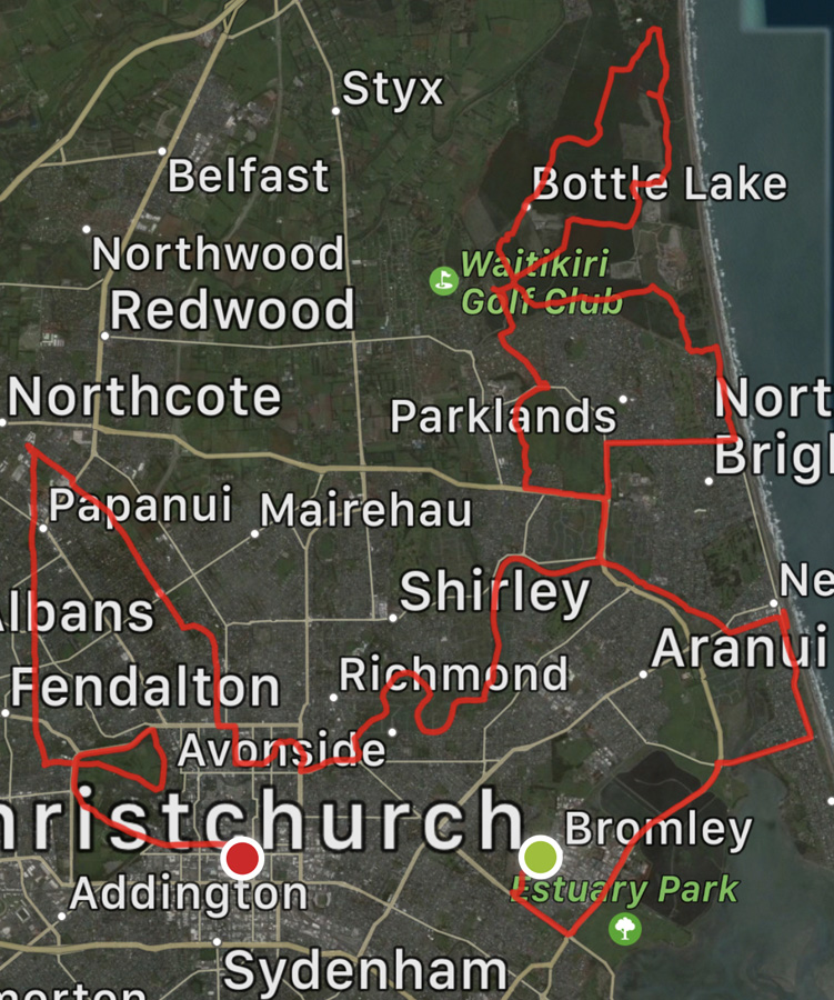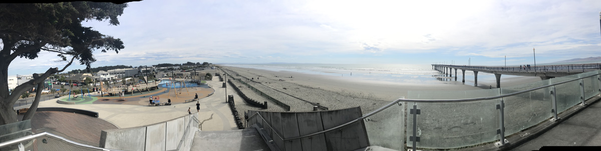 Beachside suburb of Sumner 63km Mountain bike ride New Brighton Pier Avon River Trail Bottle Lake Forest Park Red Zone - houses destroyed by the 2011 earthquake but streets and gardens remain